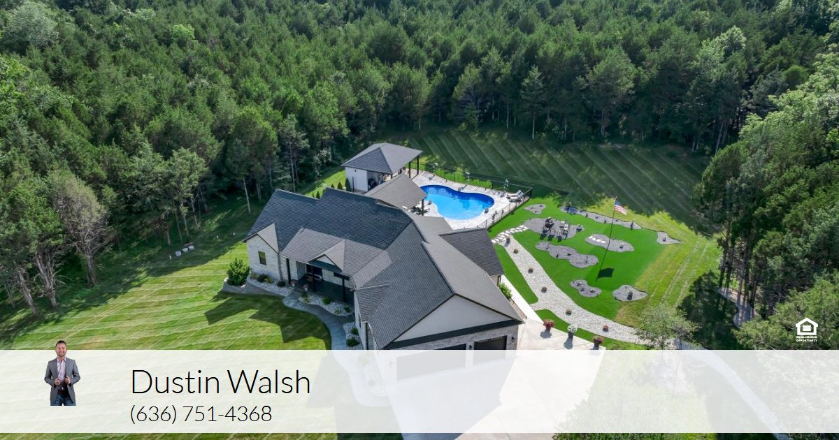 Welcome to your family's dream home. Step through elegant double doors into a sun-filled great room that feels both warm and impressive. Imagine hosting holidays and dinner parties around oversized islands, with sleek quartz countertops, under and over cabinet lighting, and a spacious hidden pantry that keeps everything organized and out of sight. Master Suite, featuring a luxurious curb-less shower with five shower heads, a separate water closet, and double vanities topped with quartz. Set on 10 acres—7 of which are beautifully wooded—this home is located on a private gated road. Vibrant landscaping welcomes you outside, where sidewalks lead to patios finished in eye-catching stamped and stained concrete. The backyard is built for entertaining: splash in the sparkling 36’x20’ in ground pool, relax in the six-person hot tub, perfect your golf game on the chipping green, or gather under two covered patios one with an electric fireplace, perfect for cozy evenings. Pool house offers a half bath for guests. The walkout basement, has a theater seating platform, game room, full bath and bedroom, three large storage areas, and an oversized safe room all with stunning stamped concrete floors. A detached 48’x64’ garage, fully insulated, a wood-burning stove, a wet bar, 1/2 bath, three garage doors, and a camper hookup. This is more than just a house—it’s a place to relax, entertain, and enjoy the best of country living with friends and family. Welcome home.  For your personal tour contact Dustin Walsh at 636-751-4368